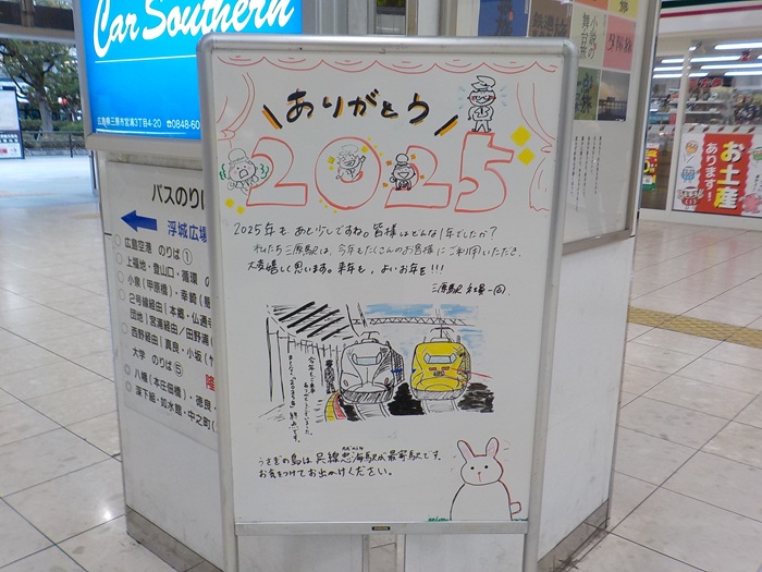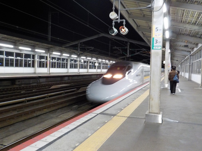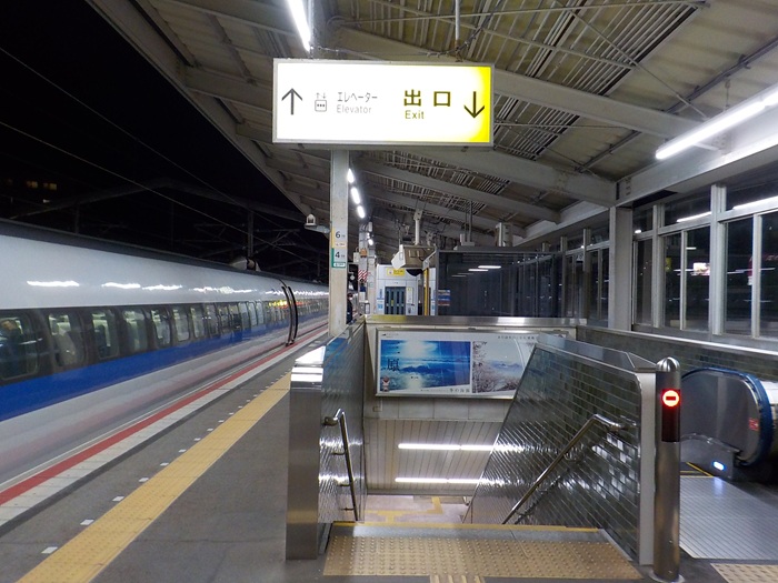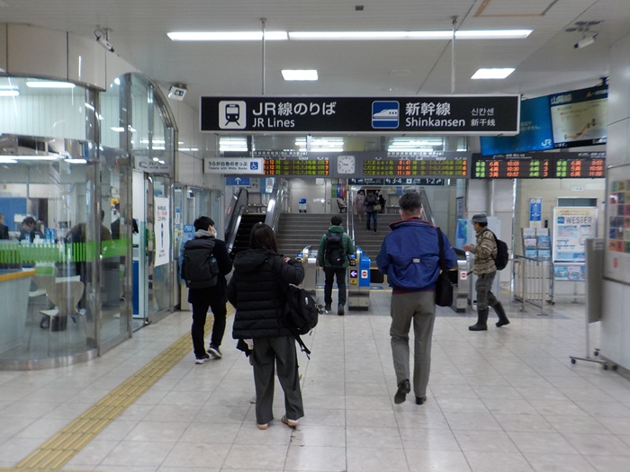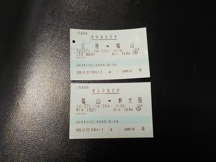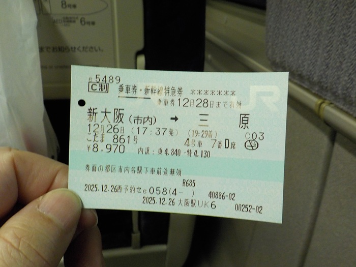 12月26日(金)新大阪駅17時37分発の新幹線こだまに乗車。新大阪駅・改札内で購入した志津屋のカルネ×2個を新神戸駅までに食べてしまい、あとは広島の三原駅まで缶ビール(一番搾り)をチビチビと飲みながら、2時間弱で三原駅に到着しました。