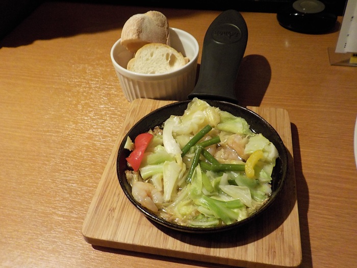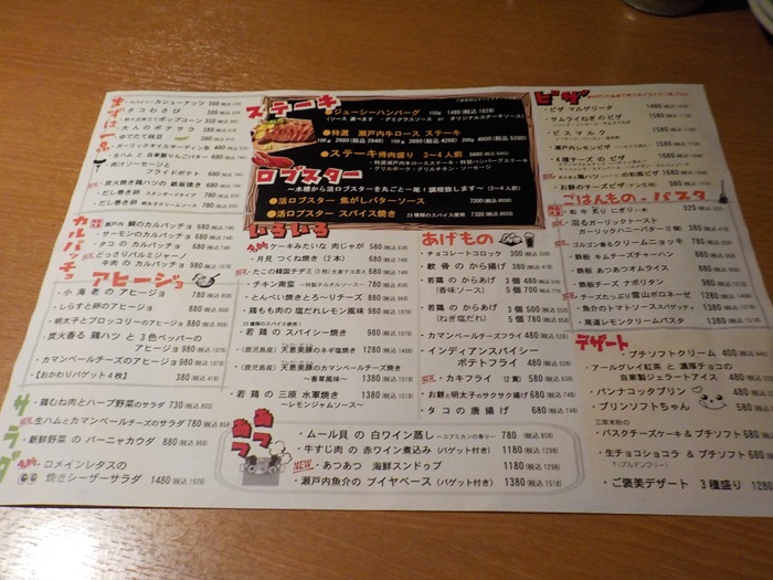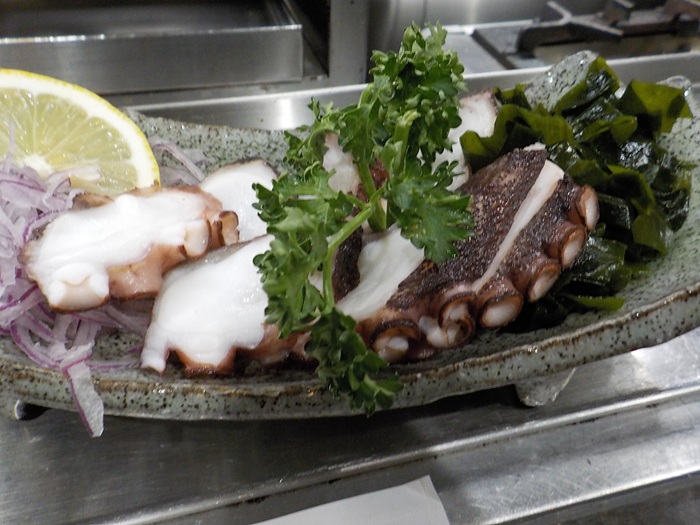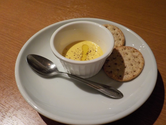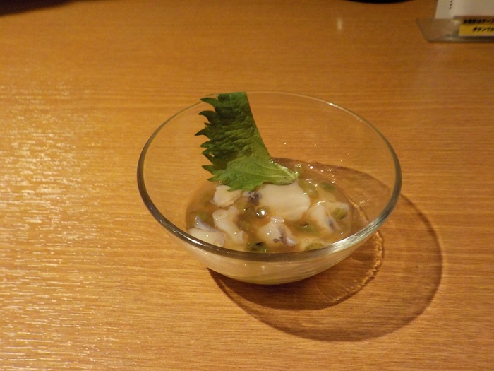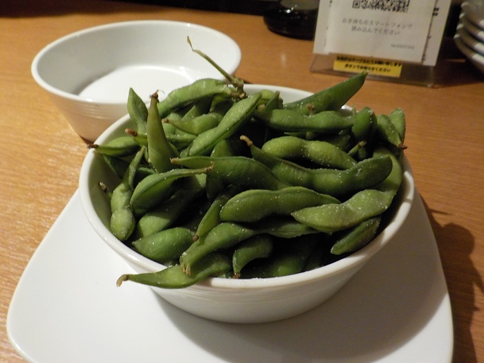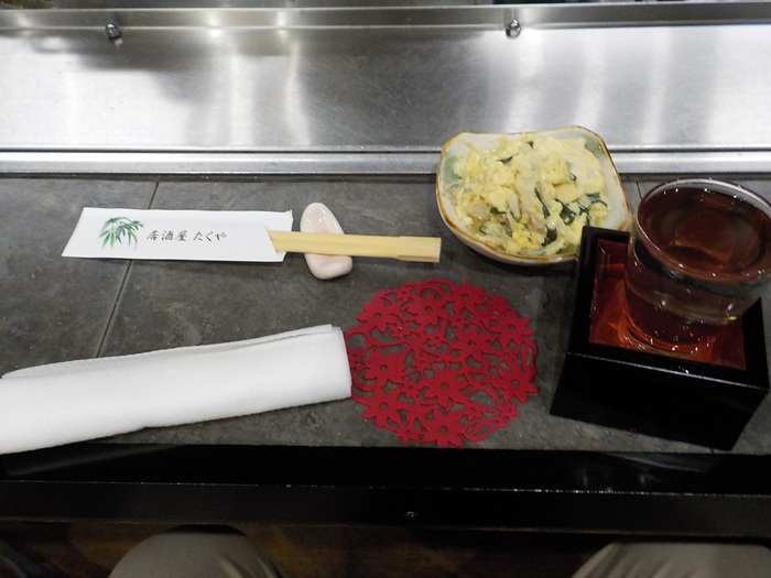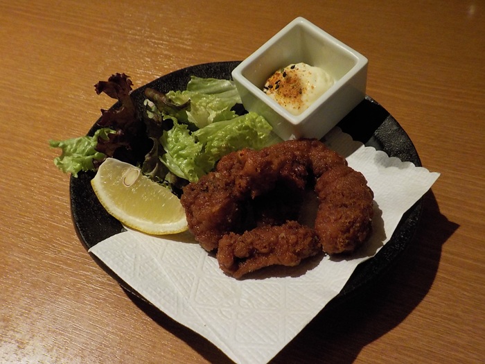 サカナザという店名ながら、ステーキやハンバーグの肉料理やピザなどがメインのお店でした。お酒もワインを中心に洋酒が多い感じで、突き出しにクリームチーズとクラッカーが出てきました。ステーキやハンバーグも魅力的でしたが、枝豆・タコわさ・蛸の唐揚げ・小海老のアヒージョ、それに、三原市の「酔心・純米吟醸」を注文しました。
