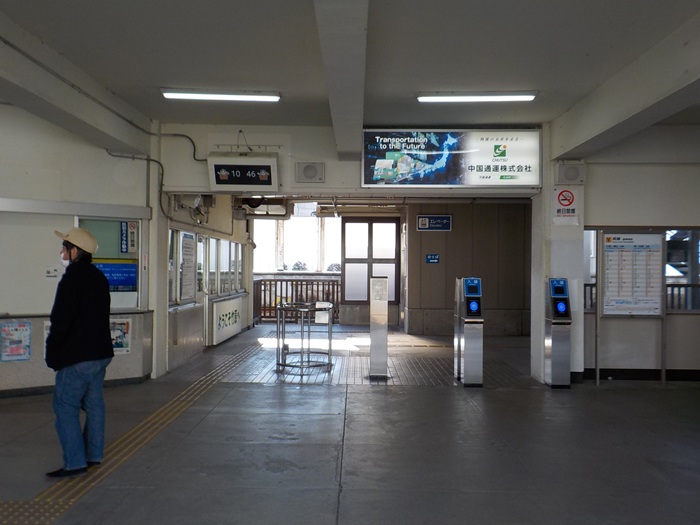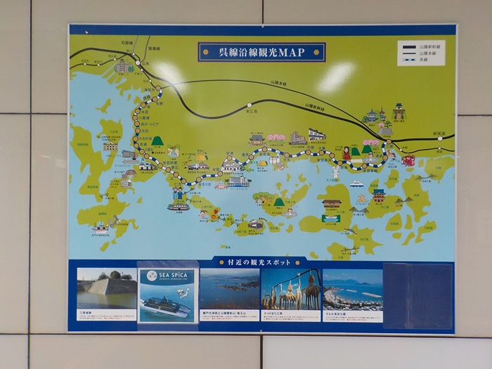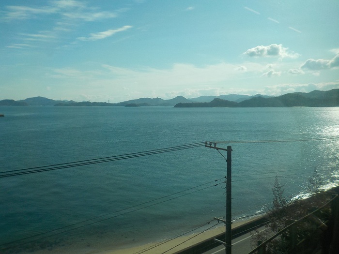 三原駅周辺を散策した後、改札前のセブンイレブンで自宅で待つ家族にお土産をゲット。そして、三原駅の改札を通って、初めての呉線で竹原駅へと向かいました。呉線は1時間に1本あるかないかのダイヤで、三原駅から竹原駅までは約35分。ちょっと不便ですが、進行方向の左手に見える穏やかな瀬戸内海が本当に綺麗です。