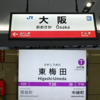 右手・頭上の行先案内表示板には、「JR大阪駅」と表示されています。